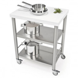 Hornbeam kitchen cart of the series Auxilium with two drawers, one pull out cutting board and one shelf underneath. The long grain hornbeam worktop is very sturdy and resistant. The drawers are made of stainless steel and can be easily detached for cleansing. The cutting board of hornbeam is placed under the second drawer and can be placed on the worktop. It is been hold in place by a stop bar. The cart has one side rail on the left and one on the right for quick fitting of accessories or a kitchen cloth.